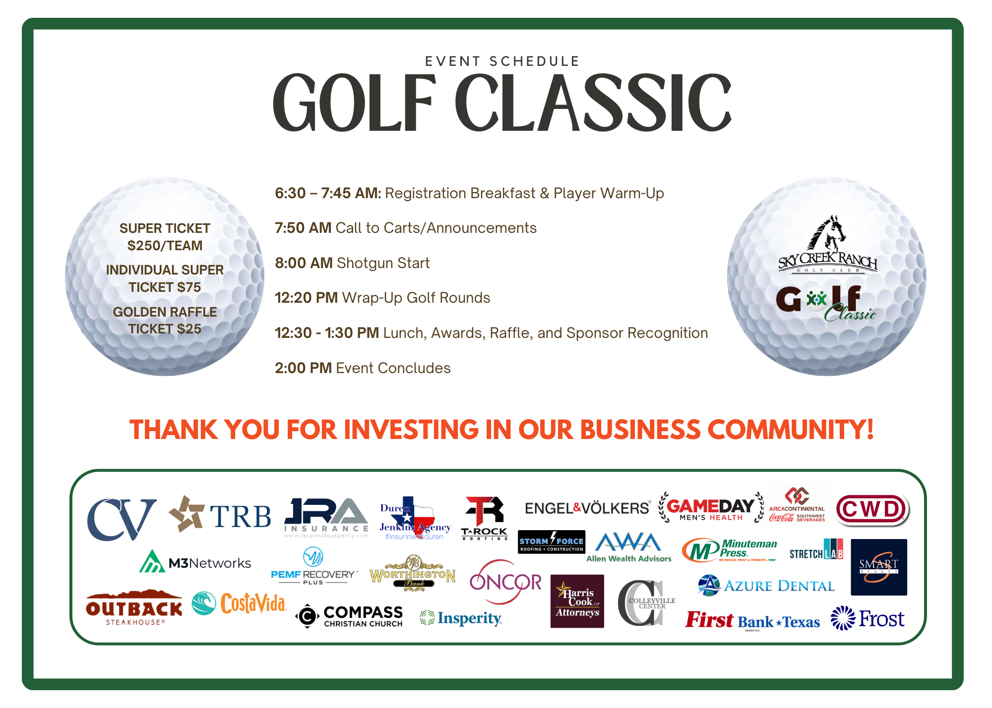 Tee off with the Colleyville Chamber at the 2025 Golf Classic—an exciting day of networking, competition, and community at Sky Creek Ranch!